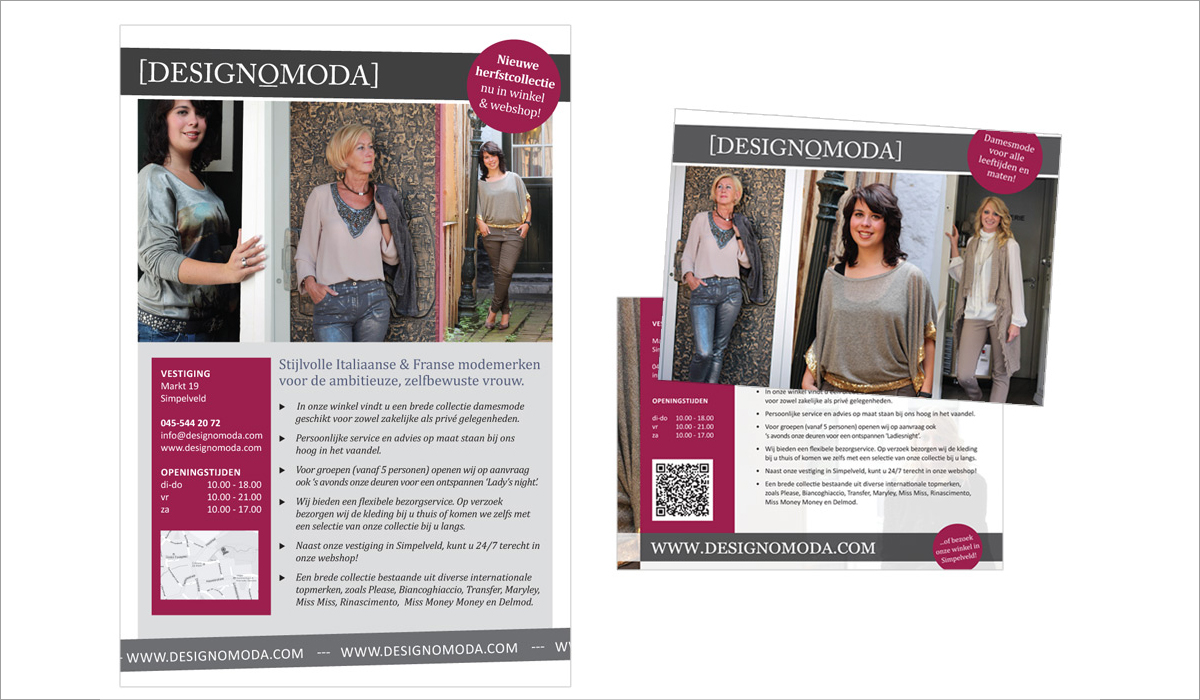 Na de Designomoda webshop, is het merk uitgebreid met een fysieke winkel. (Inmiddels is de focus volledig verschoven naar de fysieke winkel). Silver Arrows is verantwoordelijk voor de copywriting en het ontwerp van diverse drukwerk- en social media uitingen en voor het ontwerpconcept voor de winkelaankleding. Er is gekozen voor een rustige basis, met flexibiliteit in een paar eenvoudig aanpasbare elementen, om niet alleen de huidige, maar ook komende collecties goed te kunnen presenteren.