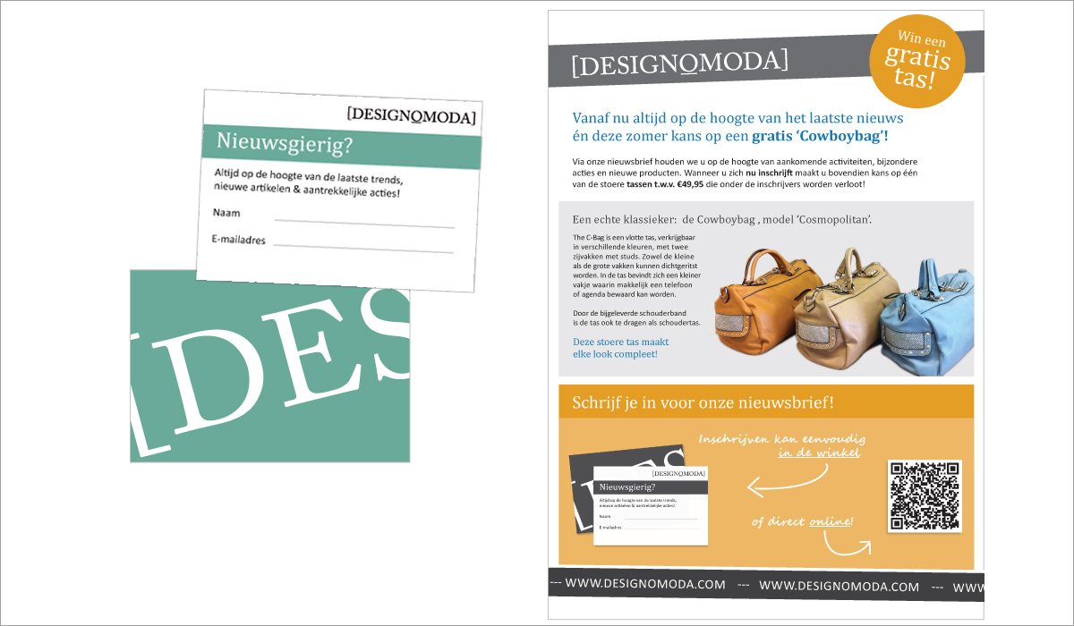 We hebben visitekaartjes, diverse flyers, posters en advertenties ontworpen ter promotie van de verschillende collecties. We hebben een Facebookpagina voor Designomoda opgezet en e-mail nieuwsbrieven om geïnteresseerden op de hoogte te houden van acties en activiteiten. Ter promotie van deze nieuwsbrief hebben we een actie, bijbehorende poster en inschrijfkaartjes ontwikkeld.